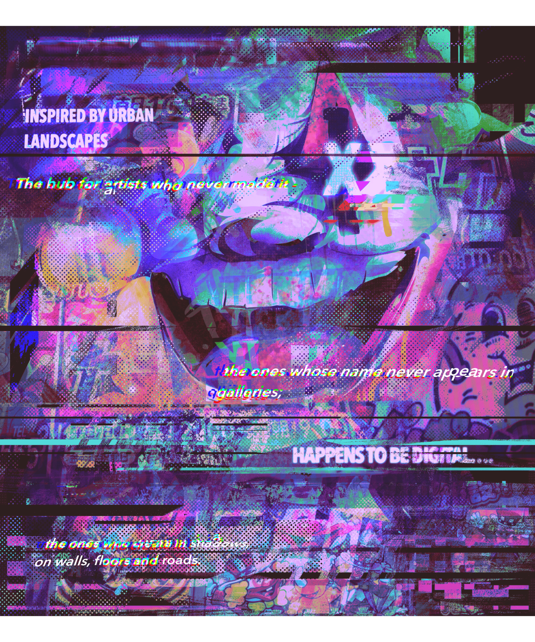 The works presented here are inspired by the nightlife of urban cities, where individuals fade into the crowd, the “me” becomes “us,” and the grayness of the surroundings slowly wraps itself around both mind and soul. Street art exists to break through that monotony—to bring bold, vivid color to the walls and roads painted in uniform tones.